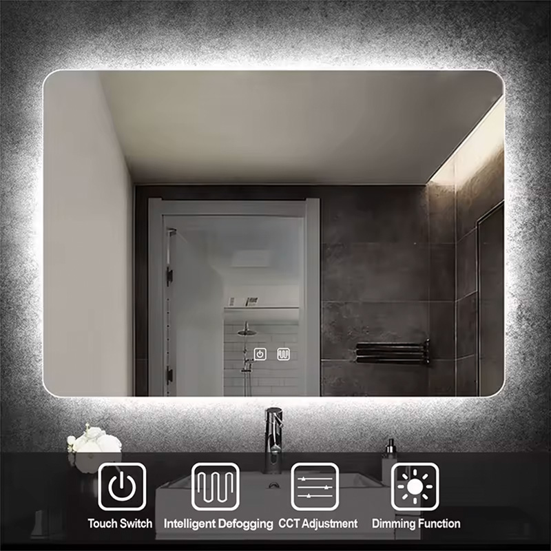 | – 5mm copper free silver mirror with defogger – 2835 120LED/m, 3000K-6000K, CRI>80 – Touch switch, Dimming & CCT Changing – Built-in CE LED driver – IP44 / Damp location – Aluminium frame |