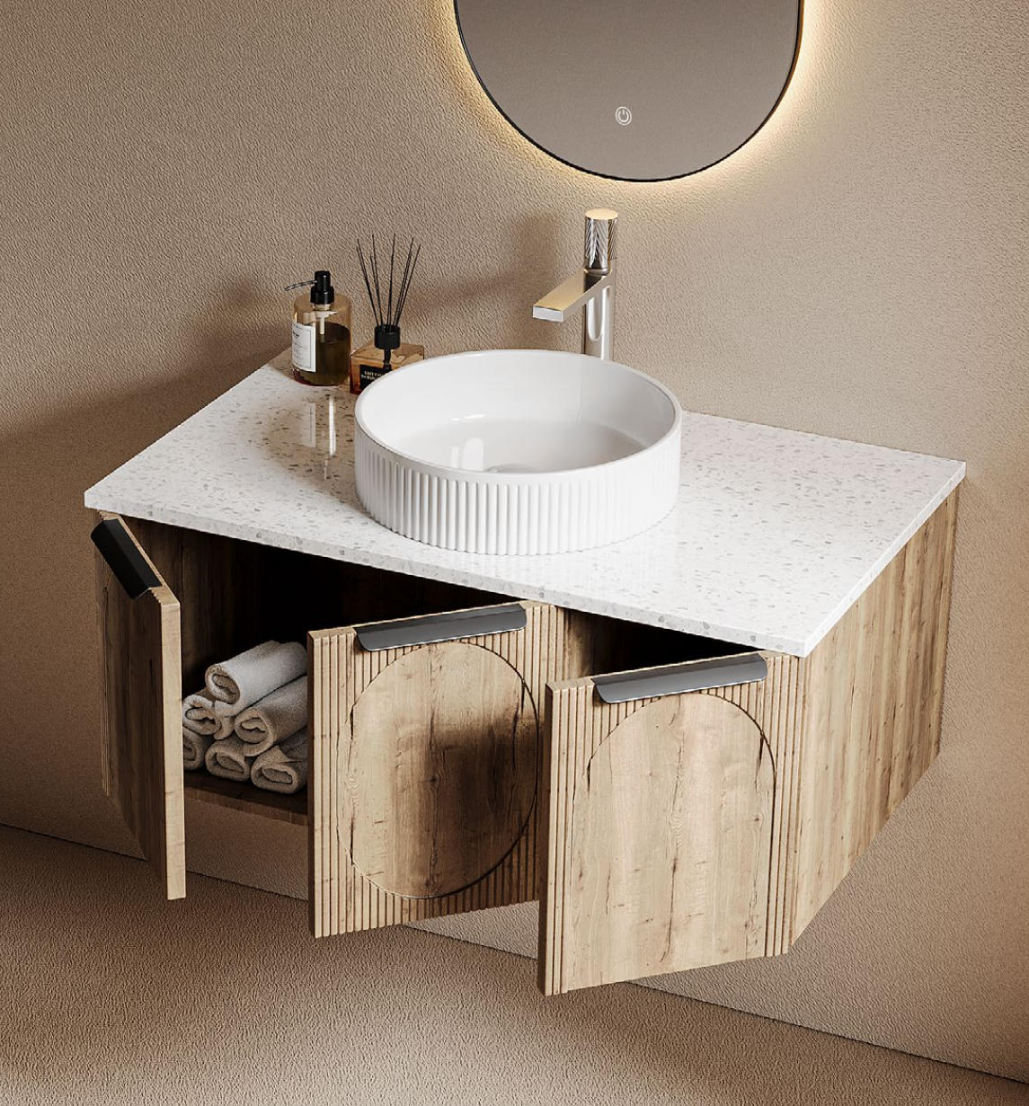 Perfect for hotel, apartment, and interior projects, this modern bathroom cabinet features textured front panels, premium finishes, and sturdy construction that deliver elegance and long-lasting performance.