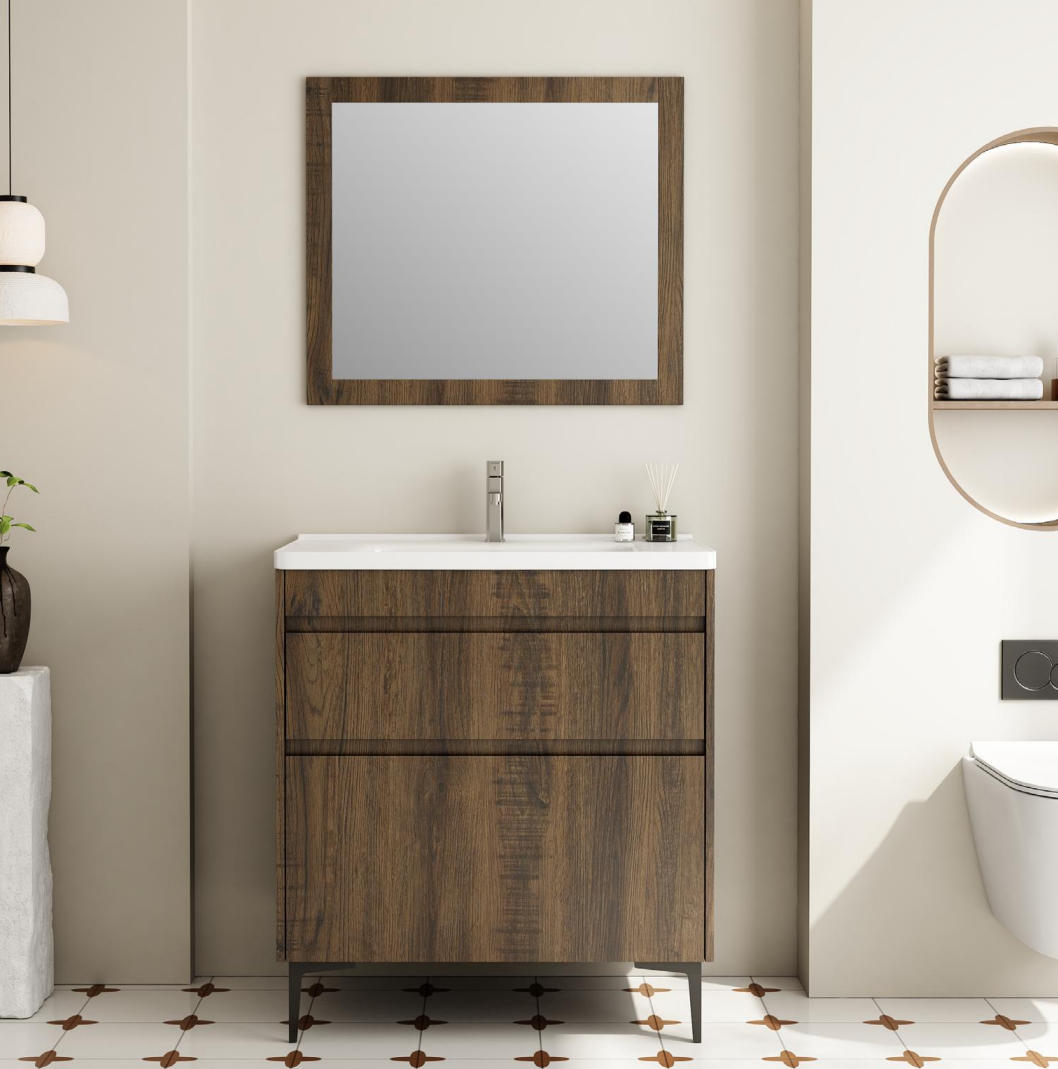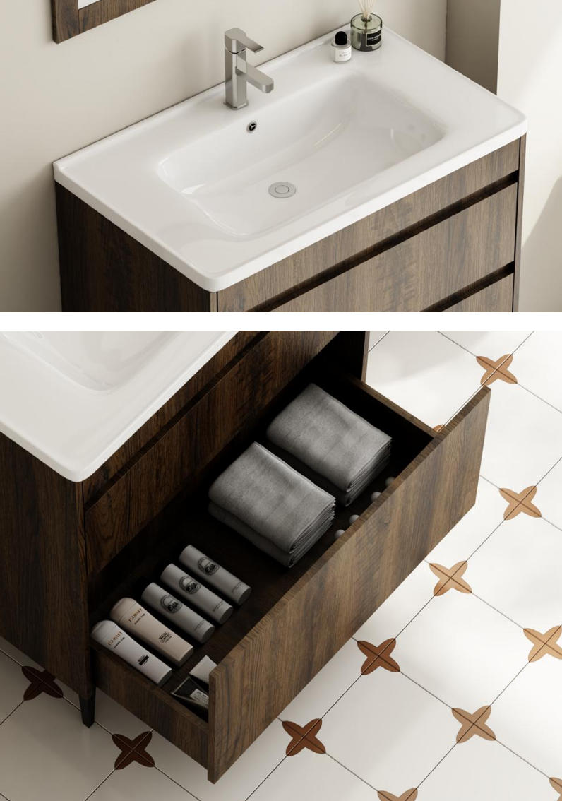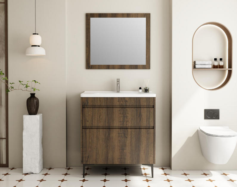 A modern wood grain bathroom vanity with mirror cabinet that blends natural texture and minimalist design. Made from durable PVC, it offers ample storage, moisture resistance, and a sleek Scandinavian look—perfect for contemporary homes or hotel bathrooms.
