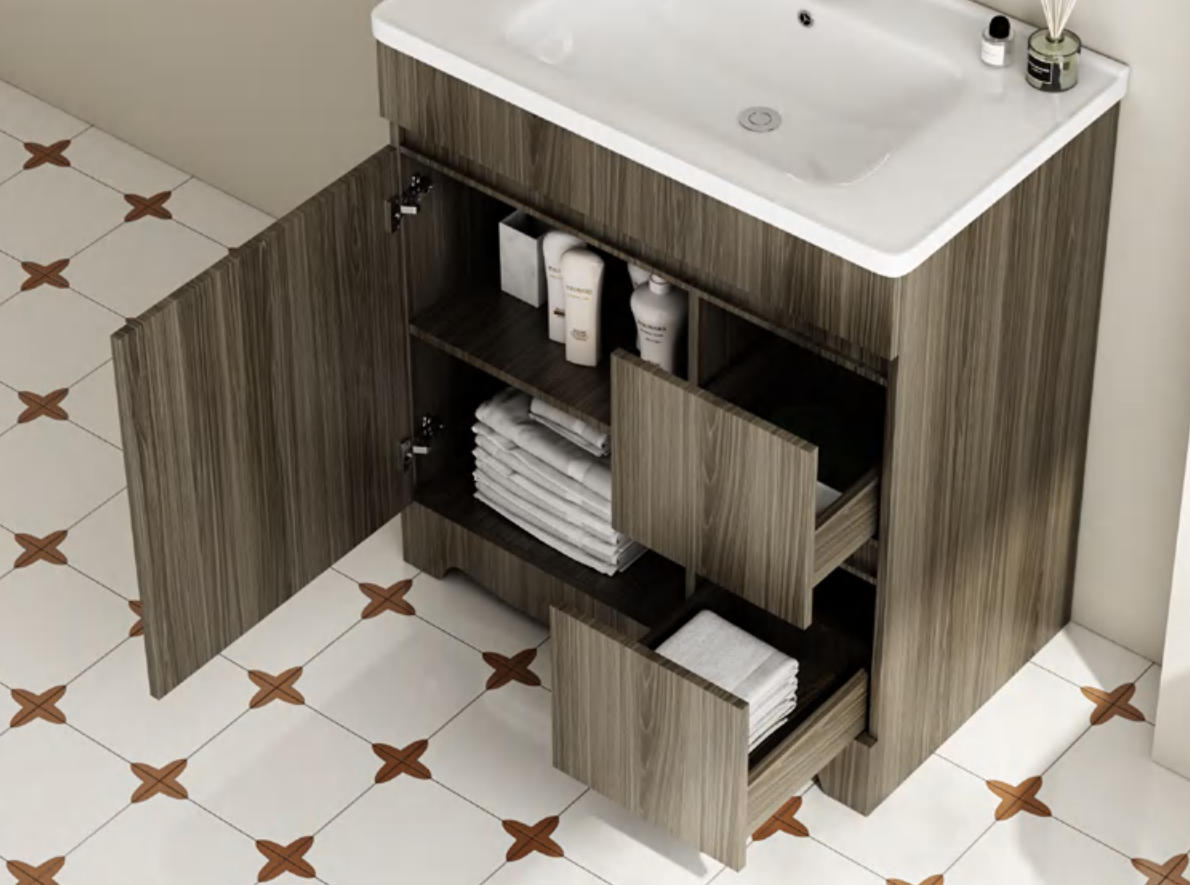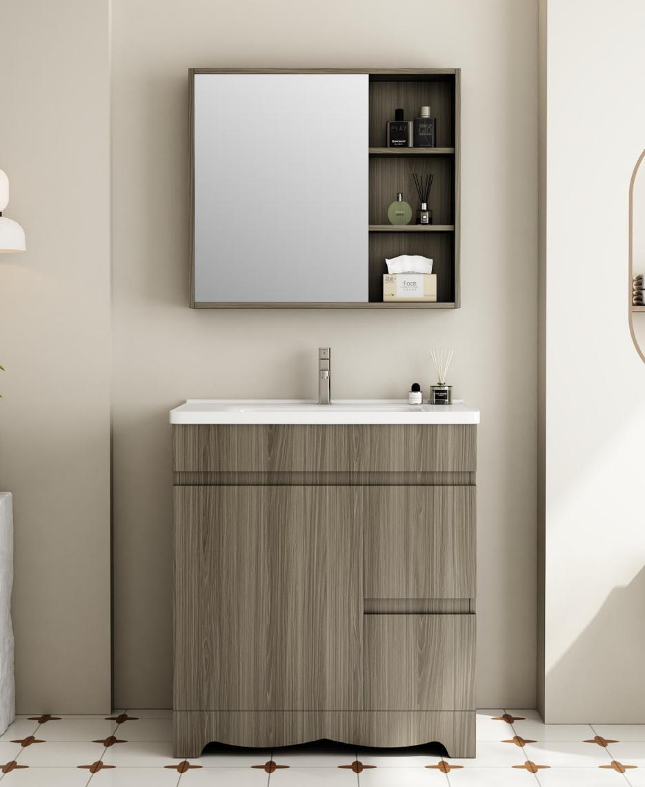 A Scandinavian-style PVC vanity unit featuring clean lines and a light wood finish. The soft-close drawers provide smooth functionality and quiet convenience, creating a calm, minimalist atmosphere ideal for modern homes and hotel bathrooms.
