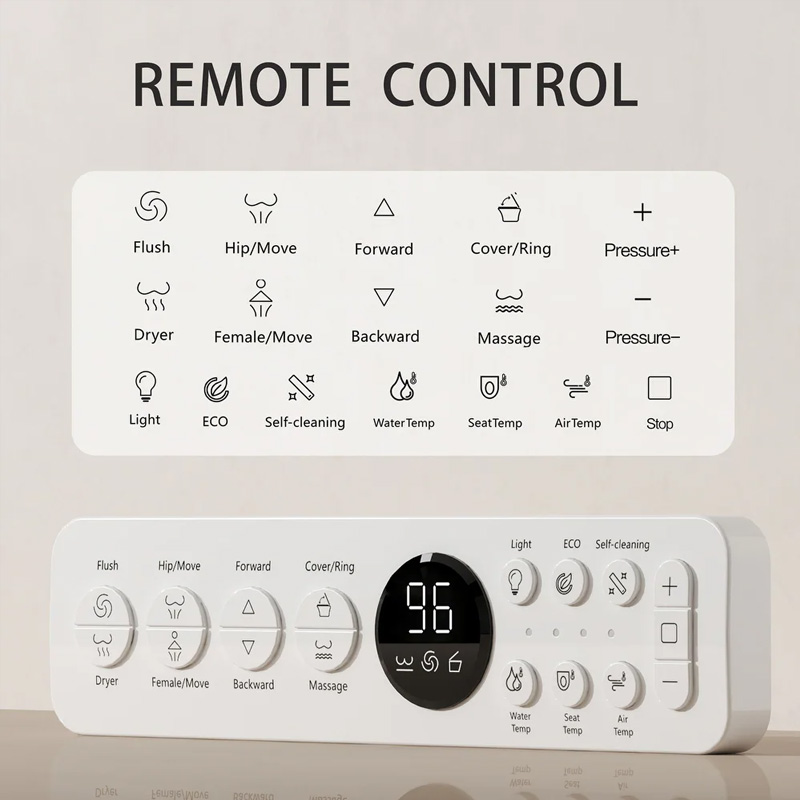Smart Remote Control, Water Pressure Adjustment, Seat Temperature Adjustment, Air Temperature Adjustment, Water Temperature Adjustment, Foot - sense Lid Lifting.