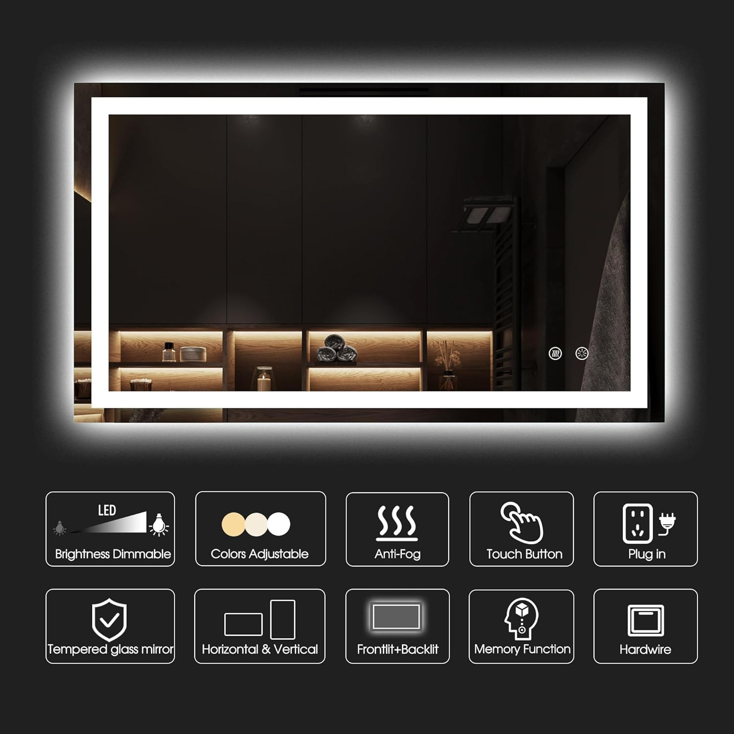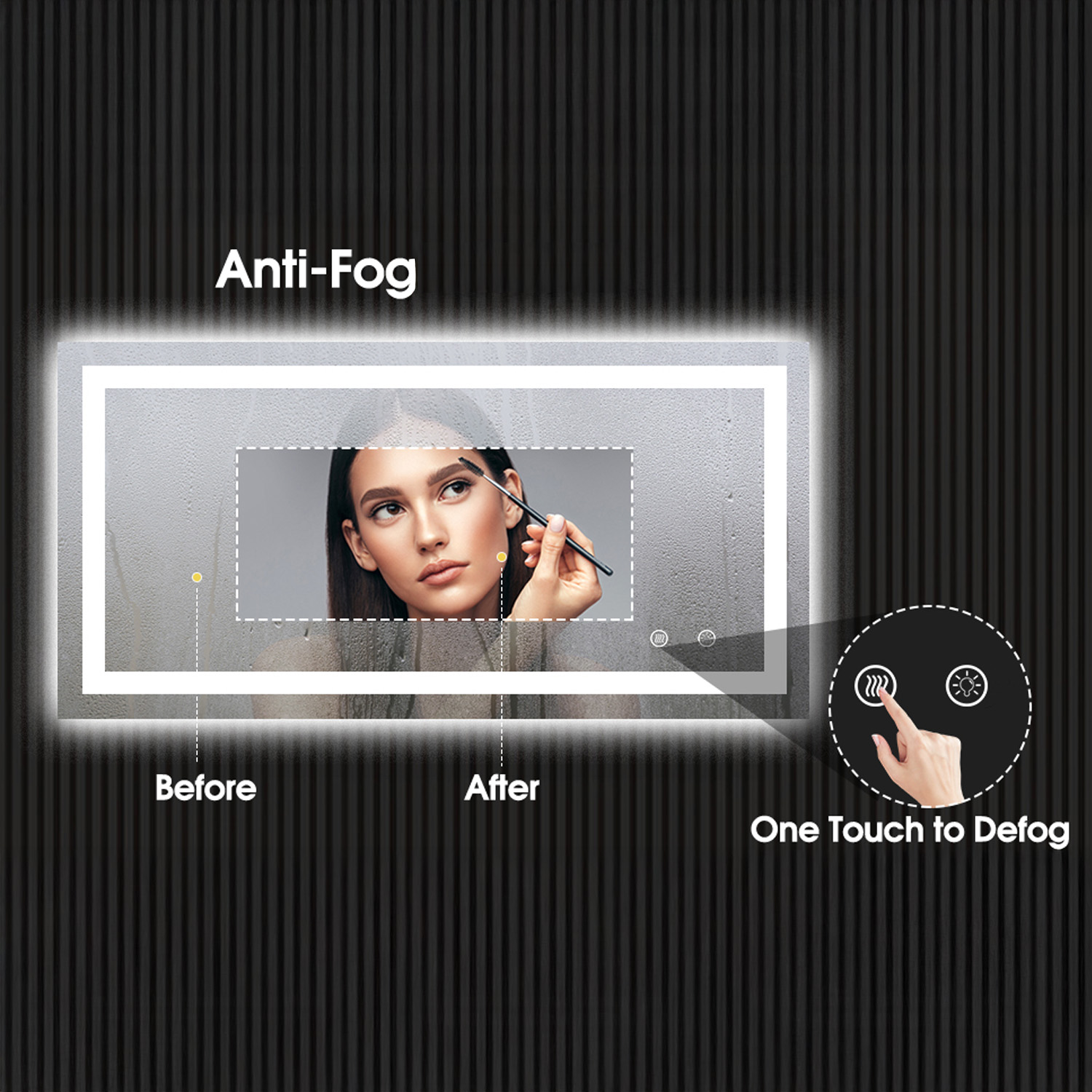 | – 5mm copper free silver mirror with defogger – 2835 120LED/m, 3000K-6000K, CRI>80 – Touch switch, Dimming & CCT Changing – Built-in CE LED driver – IP44 / Damp location – Aluminium frame |